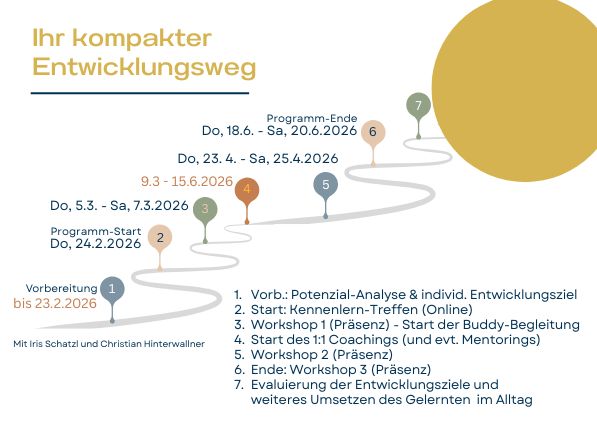Der Entwicklungsweg geht von der Auseinandersetzung mit den eigenen Werten und Stärken über das aktive Gestalten von gelungener Kommunikation bis hin zum Verständnis von Gruppen- und Systemdynamiken im Leistungskontext.